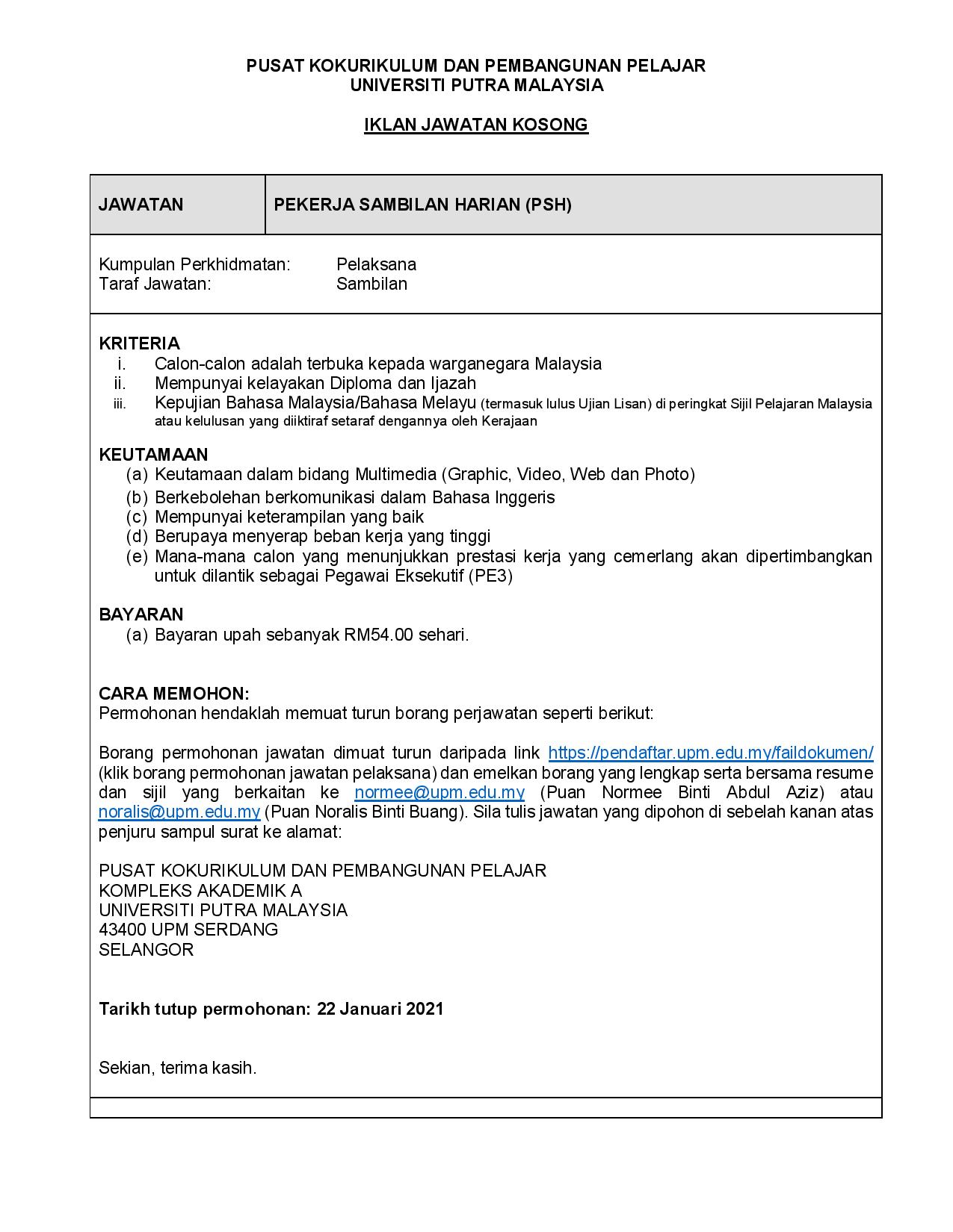 Warganegara malaysia yang berkelayakan adalah dipelawa untuk mengisi jawatan pekerja sambilan harian seperti berikut