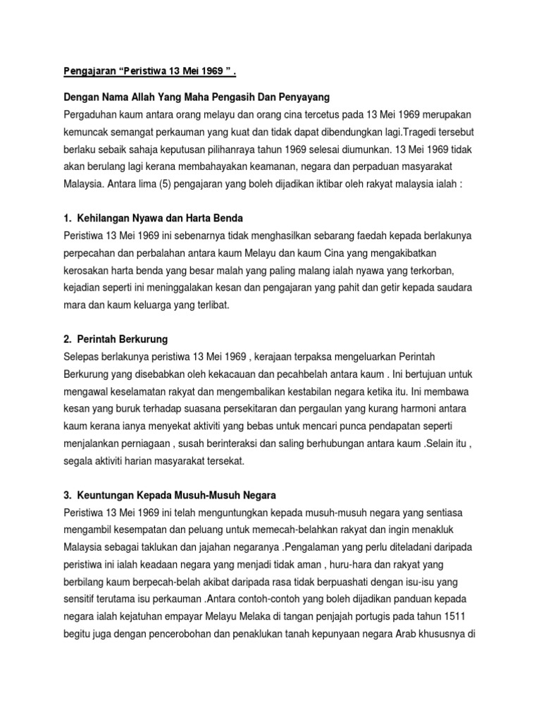 Peristiwa 13 Mei Pdf - Ia mempunyai kaitan rapat dengan pilihanraya umum 1969 dan merupakan.. Peristiwa 13 mei 1969 menyebabkan tunku abdul rahman dipersalahkan oleh orang melayu dan malaysia secara keseluruhannya. View text version category : Walaupun kita cuba memadamkan kenangan pahit itu daripda memori namun begitu, pada hakikatnya tregedi itu telah menimbulkan persolan tentang sejauh manakah perpaduan di kalangan rakyat. So please help us by uploading 1 new document or like us to download Oleh itu, sebagai rakyat malaysia, seharusnya kita.