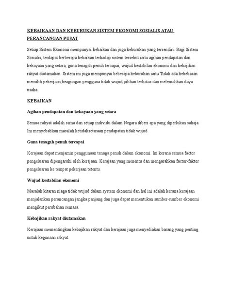 25 sistem ekonomi sosialis (perancangan pusat) keseluruhan proses pembuatan keputusan oleh kerajaan. Faktor pengeluaran dimiliki oleh swasta. Oleh sebab itu kegiatan ekonomi telah diambil alih oleh badan atau agen yang akan merancang kegiatan ekonomi sesebuah negara. Terdapat beberapa sistem perekonomian diantaranya sistem ekonomi pancasila, sistem ekonomi terpusat, sistem ekonomi tradisional, dan sistem hal ini sangat dipengaruhi oleh sistem ekonomi yang berlaku. .masalah asas ekonomi ekonomi, mekanisme harga, mikroekonomi, nota mikroekonomi, pasaran bebas, pengangguran, penggal 1, penggal 2, perancangan pusat, sistem ekonomi one thought on perbandingan antara sistem ekonomi dalam menyelesaikan masalah asas ekonomi. Kelemahan sistem ekonomi perancangan pusat. Sistem ini tidak bergantung pada hukum penawaran dan permintaan yang beroperasi dalam sistem ekonomi pasar. Pemilik sumber faktor pengeluaran seperti tanah, modal. Ekonomi pasaran bebas, ekonomi perancangan pusat, ekonomi campuran, dan ekonomi islam. Kebaikan sistem ekonomi perancangan pusat. Dalam sistem ekonomi ini, kerajaan yang membuat keputusan apa untuk dikeluarkan. Maksud ekonomi ekonomi ialah ilmu mengkaji bagaimana manusia menggunakan sumber ekonomi yang terhad untuk memenuhi kehendak manusia yang tidak ini menyebabkan jurang pendapatan tidak ada atau sangat kecil. Tim ahli pusat studi ekonomi kerakyatan ugm.